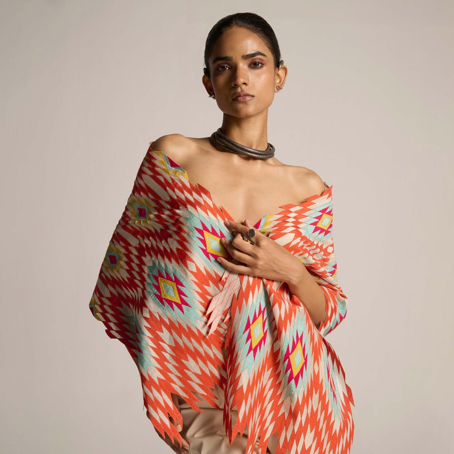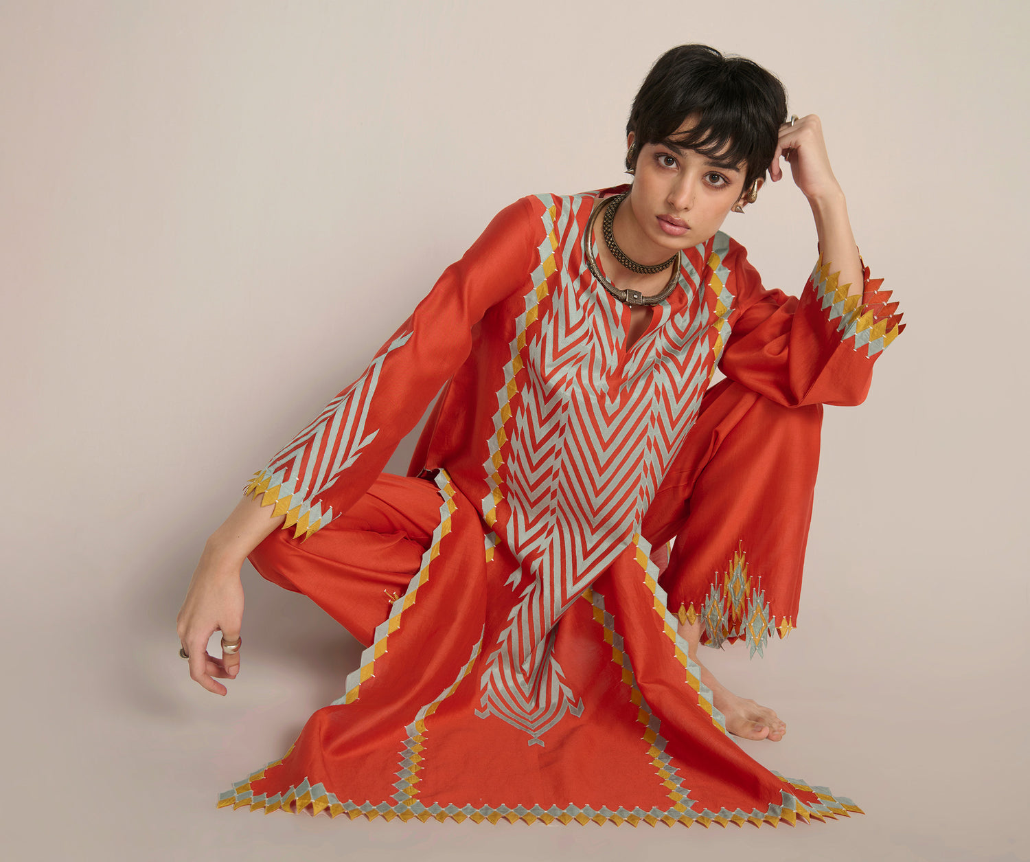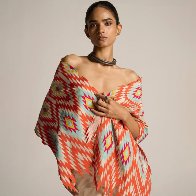 The geometric artworks are then applique'd, hand-cut by skilled craftsmen and engineered to garment patterns.