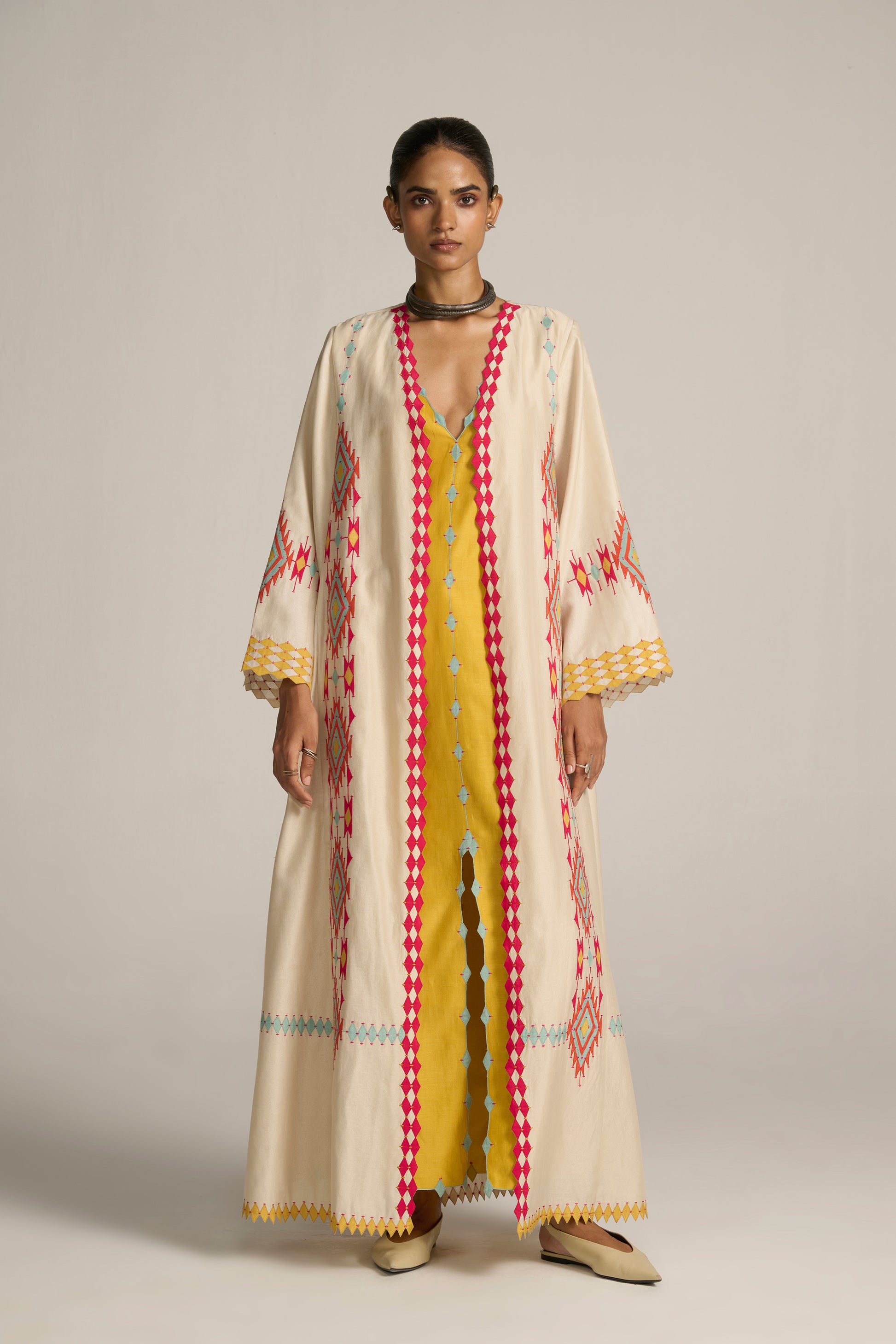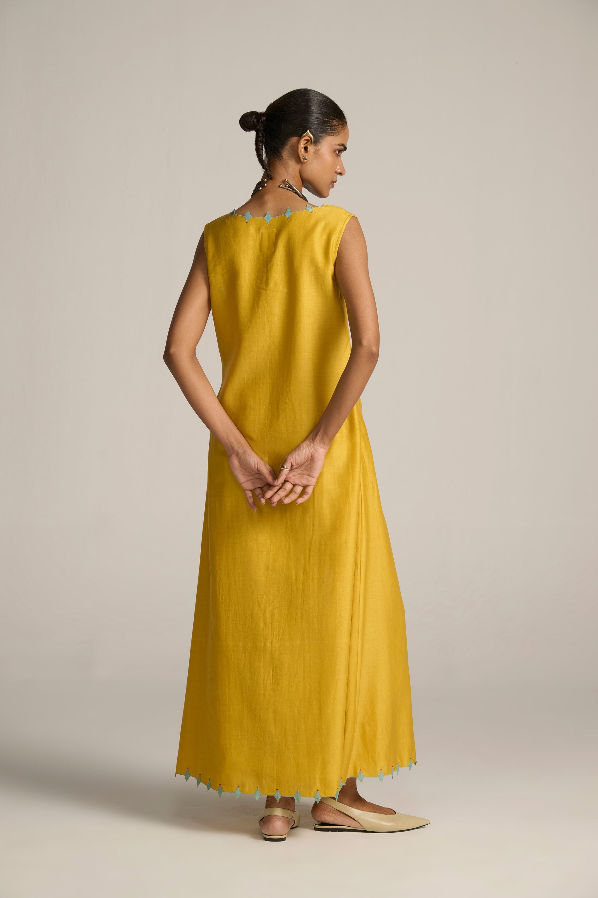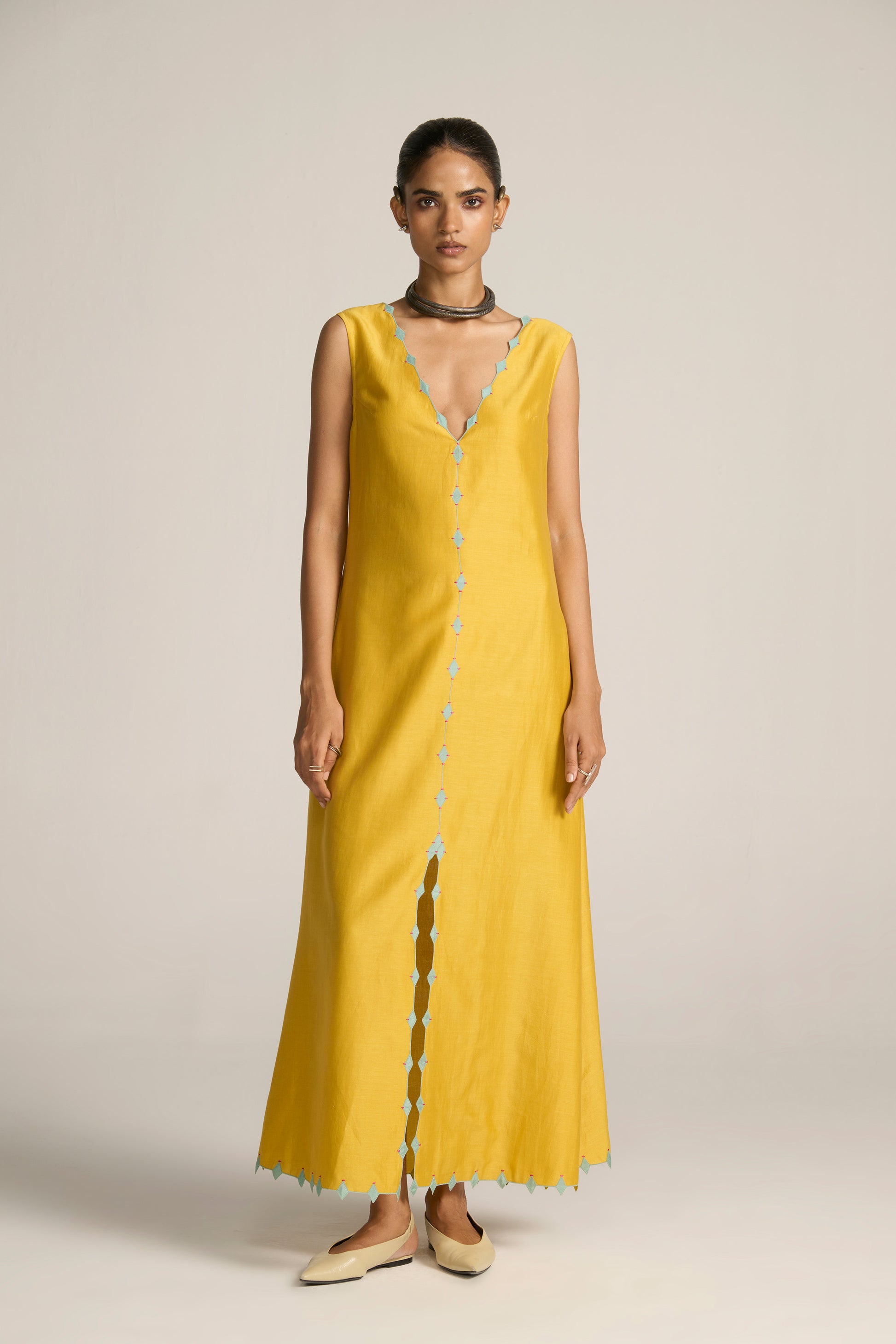 When ordering a full set, Slip Dress fabric used is Cotton Silk Chanderi with Cotton Lining, Colour : Marigold Yellow, Length : 56"/142.2cm. (style code: SLD15063)